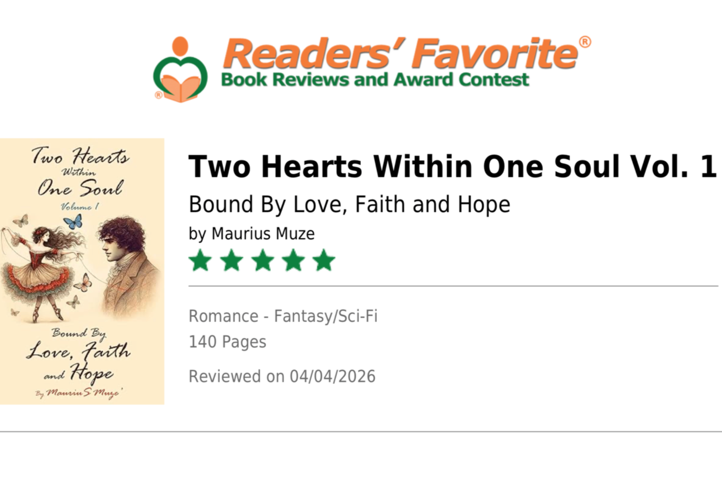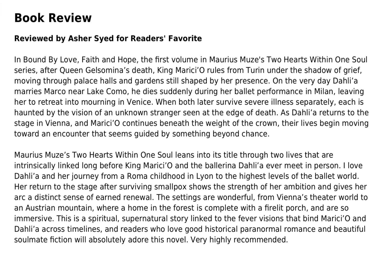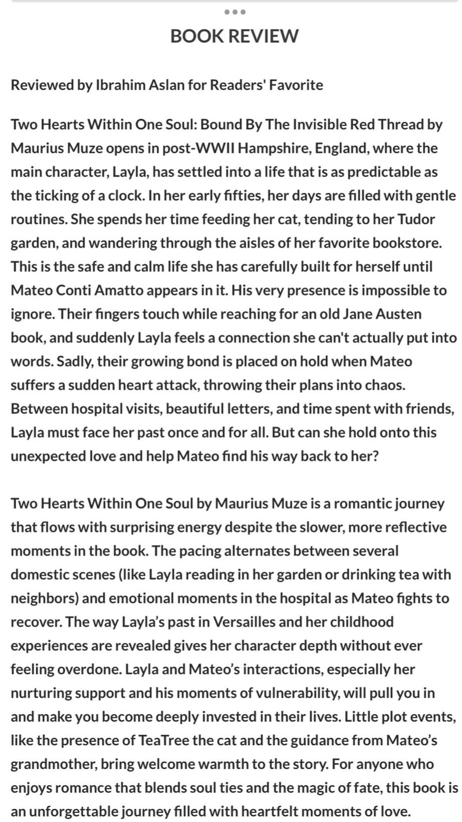 “MariuS Muze’ is a masterful writer. Every page of Two Hearts Within One Soul feels like a waltz through time and memory. Even the characters’ names are poetic and unforgettable. The story captures the agony and wonder of being bound to someone beyond a single lifetime. It’s beautiful, eternal, and utterly timeless. Such love will sweep you away!”